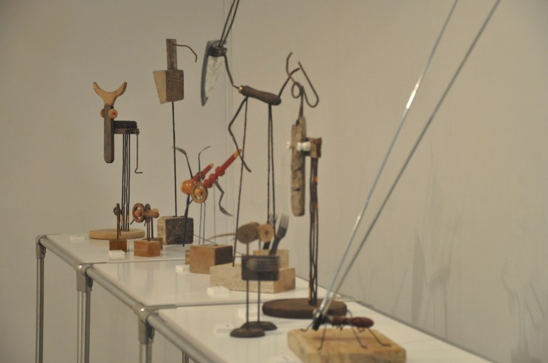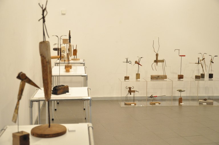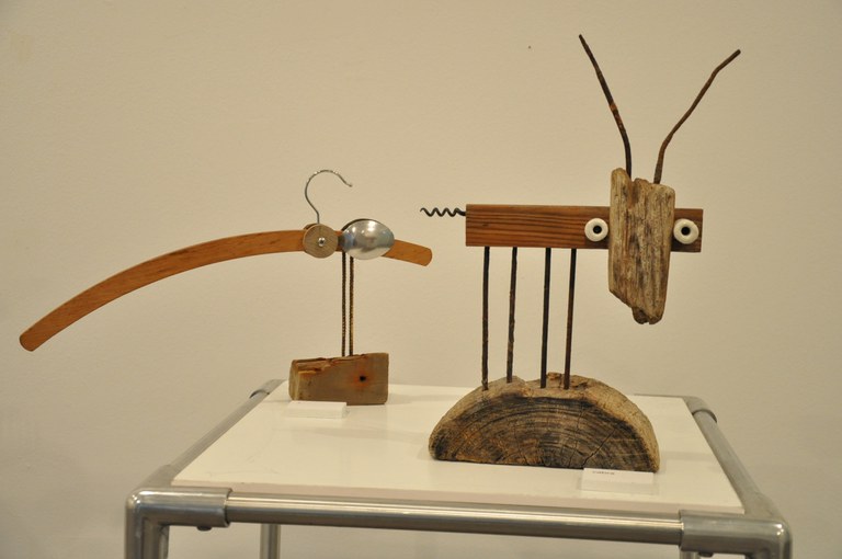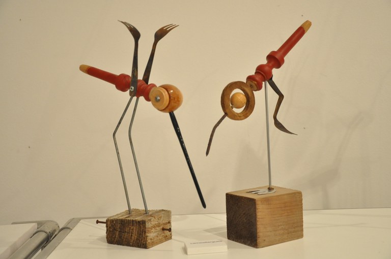 Forquilles, ganivets, ganxos, mànecs, cargols... objectes de diferents materials engalzats formant simpàtics animals, fruit de l'observació de la natura per part de l'artista.