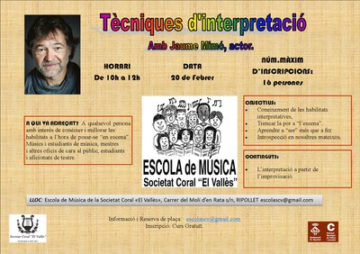 Taller amb l'actor Jaume Mimó, adreçat a qualsevol persona amb interès de conèixer i millorar les seves habilitats a l'hora de posar-se en escena.