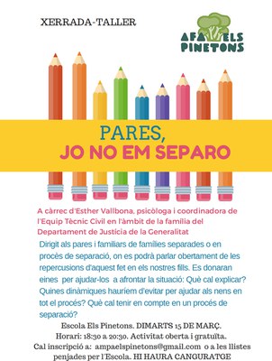 Dirigit a pares i mares de famílies separades o en procés de separació. En el taller es donaran eines per ajudar els fills a afrontar la situació. A càrrec d'Esther Vallbona, psicòloga i coordinadora de l'Equip Tècnic Civil en l'àmbit de la família del Departament de Justícia de la Generalitat.