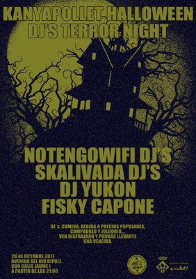 Festa de Halloween de l'Associació Musical Kanyapollet, amb DJs locals, concurs de disfresses, premis i ball a preus populars.