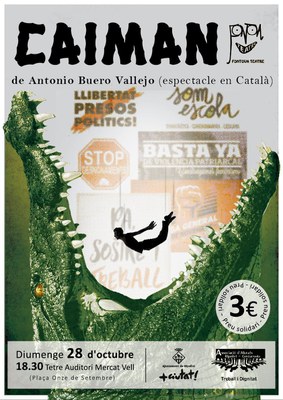 El grup Fontova Teatre porta a escena "Caiman", d'Antonio Buero Vallejo, una obra que ens situa en un barri obrer dels anys 80 on una parella lliberal d'activistes lluita per millorar la vida dels seus veïns, malgrat el drama familiar que pateixen per la desaparició de la seva filla. Organitzat en col·laboració amb l'Ajuntament de Ripollet.