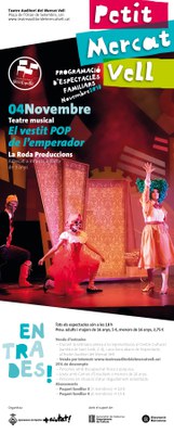 Cal un vestit únic per a un emperador únic, tan especial que només els més llestos de palau el puguin apreciar. Algú reconeixerà la veritat sobre el nou vestit de l’emperador? El vestit POP de l’emperador, un muntatge de teatre musical de La Roda Produccions, està adreçat a infants a partir de 3 anys. Preu: 5 € (majors de 16 anys) i 3,75 € (menors de 16 anys). Compra d’entrades al Centre Cultural, teatreauditoridelmercatvell.cat o a la taquilla del Teatre, una hora abans de l’espectacle.