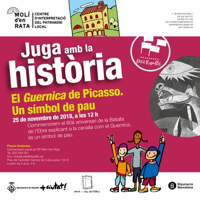 Commemorem el 80è aniversari de la Batalla de l'Ebre explicant a la canalla com el Guernica de Picasso és un símbol de pau. Consulteu la disponibilitat de places, al telèfon 93 594 60 57 o enviant un correu electrònic a molidenrata@ripollet.cat. Preu: menors de 5 anys, 1,50 € i a partir de 5 anys, 4 €.