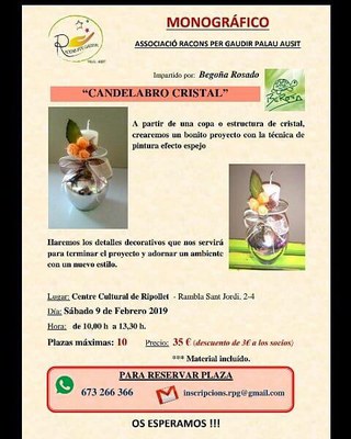 A partir d'una copa o estructura de cristall, crearem un bonic projecte amb la tècnica de pintura d'efecte mirall. Màxim de 10 places. Preu: 35€ (material inclòs). Reserves al 673.266.366 o a inscripcions.rpg@gmail.com