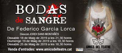 Representació de Bodas de sangre, de Federico García Lorca, a càrrec d'Amics del Teatre. Dirigida per Jordi Sans Montañés. Dissabte 18 a les 21.30 h i diumenge 19 a les 18.30 h. Entrades a amicsdelteatre.cat
