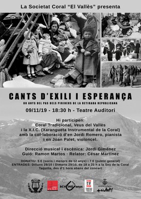 Concert coral commemoratiu dels 80 anys del pas dels Pirineus de la retirada republicana. Acte inclòs al programa de les II Jornades de Memòria històrica de Riopllet. Preu: 5 € socis i menors de 12 anys, 7 € públic general.