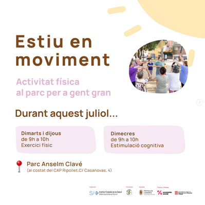 Durant aquest juliol, els dimarts, dimecres i dijous, de 9 a 10 h, al parc d'Anselm Clavé, activitat dfísica adreçada a persones majors de 65 anys, gratuïta i sense inscripció.