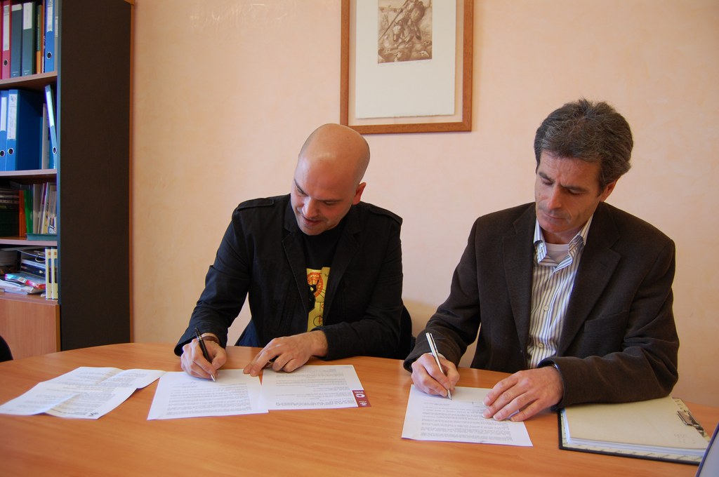 FOTO: El regidor de Joventut, Ferran Tornel, i el director de l'IES Palau Ausit, Josep Alfaro, en el moment de la signatura.