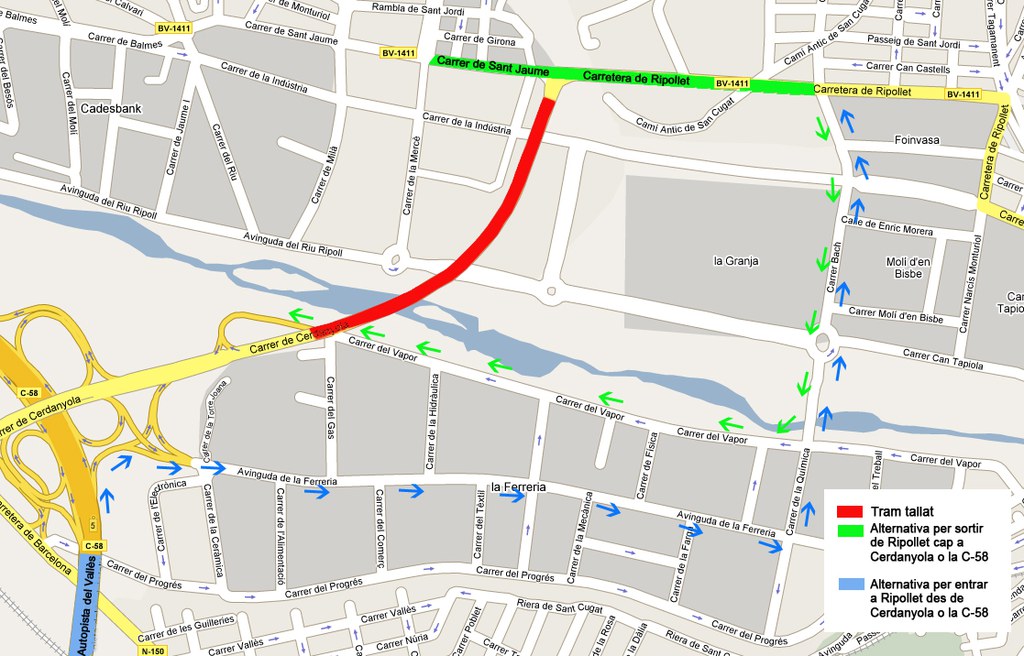 La sortida de Ripollet cap a l'autopista i Cerdanyola es farà per Montcada, pels carrers Bach i Vapor, fins enllaçar de nou amb la carretera de Cerdanyola, passat el pont. L'entrada a Ripollet es desviarà per l'avinguda de La Ferreria, carrer de la Química i Bach, fins a la carretera de Ripollet (BV1411).