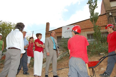 FOTO: La consellera de Treball, Maria del Mar Serna, i l'alcalde de Ripollet, Juan Parralejo, amb els joves que rehabiliten la Font de Can Mas.