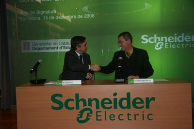 Foto: el director general d'Ensenyaments Professionals, Artístics i Especialitzats, Josep Francí, i el director general d'Schneider Electric España SA, Enrique Valer, durant la signatura.