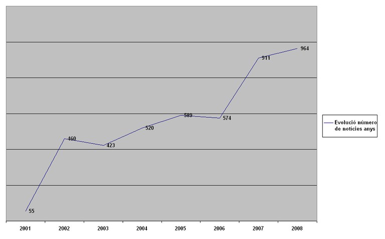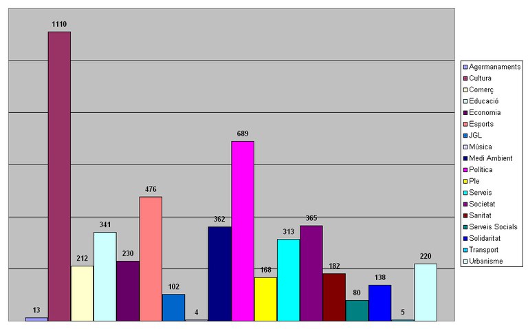 A l'apartat de cultura s'han realitzat 1.110 notícies, seguit de l'apartat de política que compta amb 689 registres. D'altra banda, també s'han introduït, fins al dia d'avui, 3.242 actes d'agenda. En relació a les notícies publicades anualment, l'any 2006 es van publicar 574 notícies, mentre que el 2007 i el 2008 es van superar les 900. En aquesta primera meitat de 2009, ja s'han publicat 501 noticies.