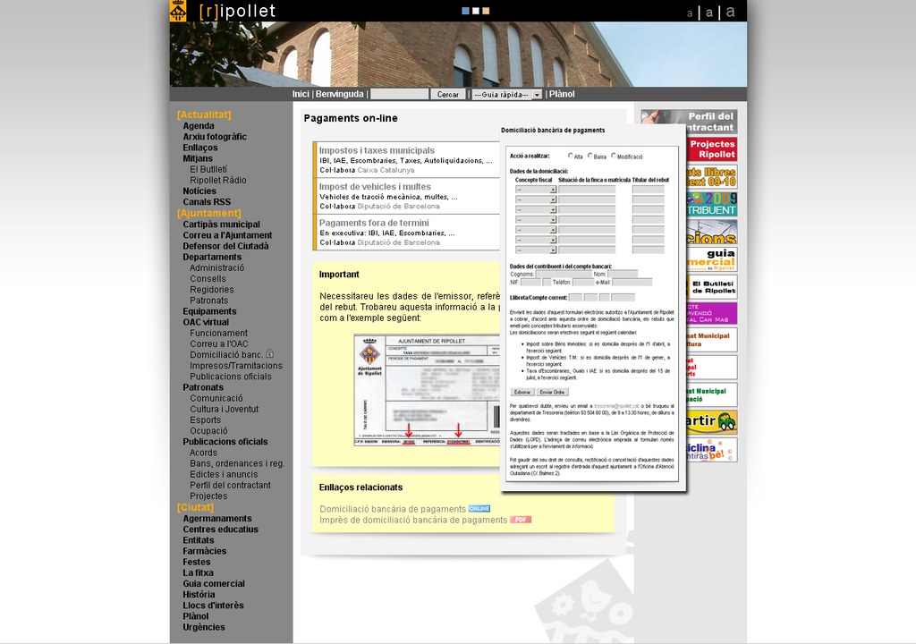 L'Ajuntament de Ripollet posarà en marxa el proper 23 de juliol el servei de pagaments d'impostos en línia a través de la web municipal . La iniciativa, que compta amb la col·laboració de Caixa Catalunya i la Diputació de Barcelona, permet la liquidació de tots els impostos i taxes gestionats directament pel consistori, així com els delegats a l'Organisme de Gestió Tributària de la Diputació, com ara l'impost de vehicles, les multes de trànsit i també les liquidacions de pagaments fora de termini.