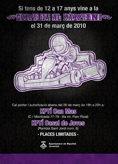 La Regidoria de Joventut, a través del programa del Kftí del Casal de Joves i el Kftí de Can Mas, ha organitzat una sortida oberta a tots els joves de Ripollet per tal de promoure la participació i donar a conèixer el servei de Kftí. Els i les joves aniran a fer Karting i passar una bona estona tot fomentant els valors i la convivència. Aquesta sortida tindrà lloc el proper dimecres 31 de Març del 2010. Es poden inscriure els joves de 12 a 17 anys empadronats a Ripollet.