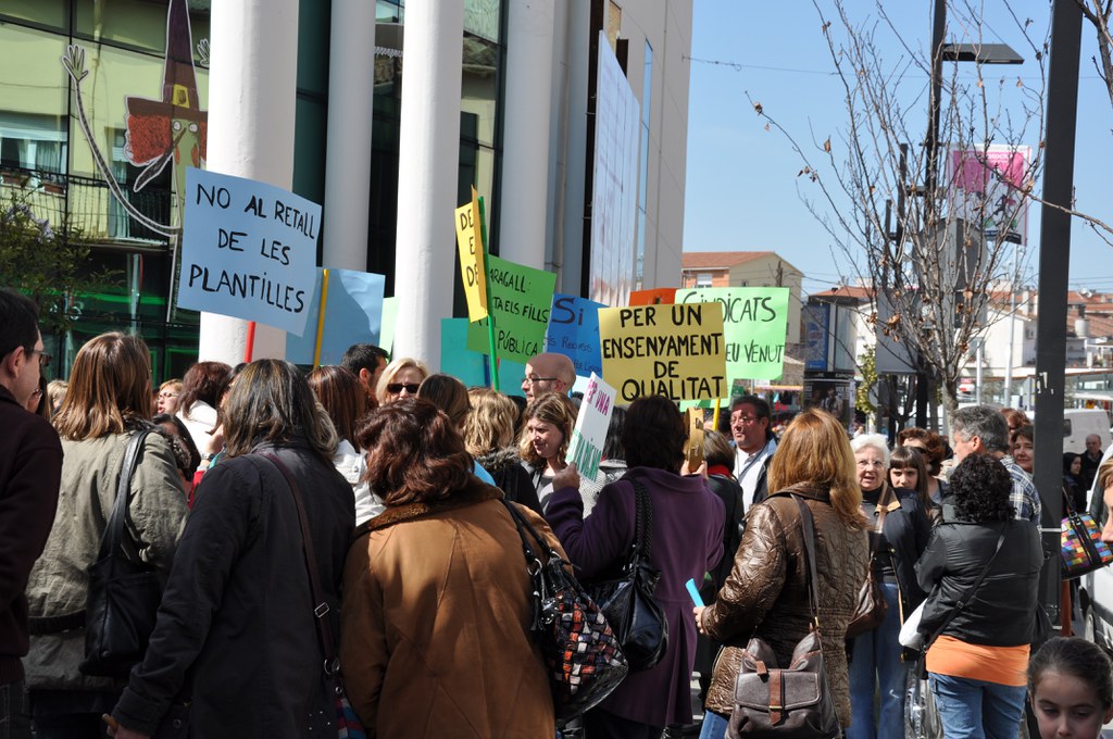 Més d'un centenar de mestres de les escoles públiques de Ripollet s'han concentrat aquest dimecres, 17 de març, al migdia, davant del Centre Cultural, per manifestar la seva oposició a la política educativa del Departament d'Educació de la Generalitat. La major part de professors no ha secundat la vaga convocada pels sindicats USTEC·STEs, CCOO, ASPEPC-SPS, FETE-UGT i CGT, però sí han volgut manifestar el seu desacord amb alguns punt de la nova Llei d'Educació catalana.