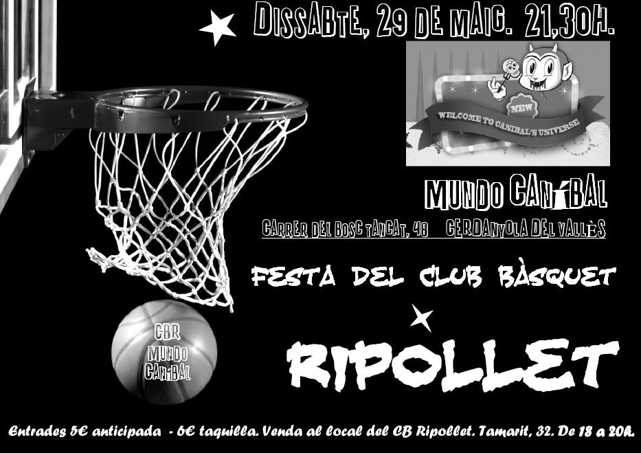 El Club de Bàsquet Ripollet ha organitzat un festa per tancar la temporada actual, que tindrà lloc el proper dissabte, 29 de maig, a les 21.30 hores, a la Sala Mundo Canibal de Cerdanyola del Vallès. L'entrada costarà 5 euros anticipada i 6 euros a taquilla. Qui vulgui comprar-les a l'avançada, ho podrà fer a partir del dilluns 24 de maig, de 18 a 20h, a les oficines del Club, al carrer de Tamarit, 32.