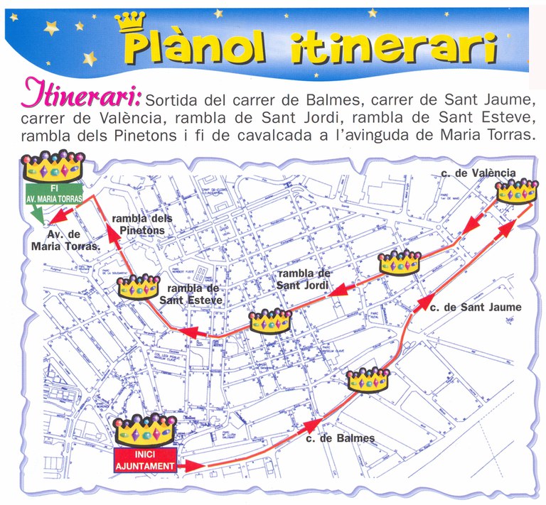 L'inici de la Cavalcada està previst per a dos quarts de set de la tarda, des del carrer de Balmes i continuarà per Sant Jaume, València, la rambla de Sant Jordi, Sant Esteve, Pinetons i acabarà a Maria Torras (veure imatge inferior). Els reis i patges repartiran 1.800 kg de caramels sense gluten. La cavalcada anirà precedida per la coreografia del Gimnàs Diver-fit. L'acte es podrà seguir en directe per Ripollet Ràdio (91.3 FM).