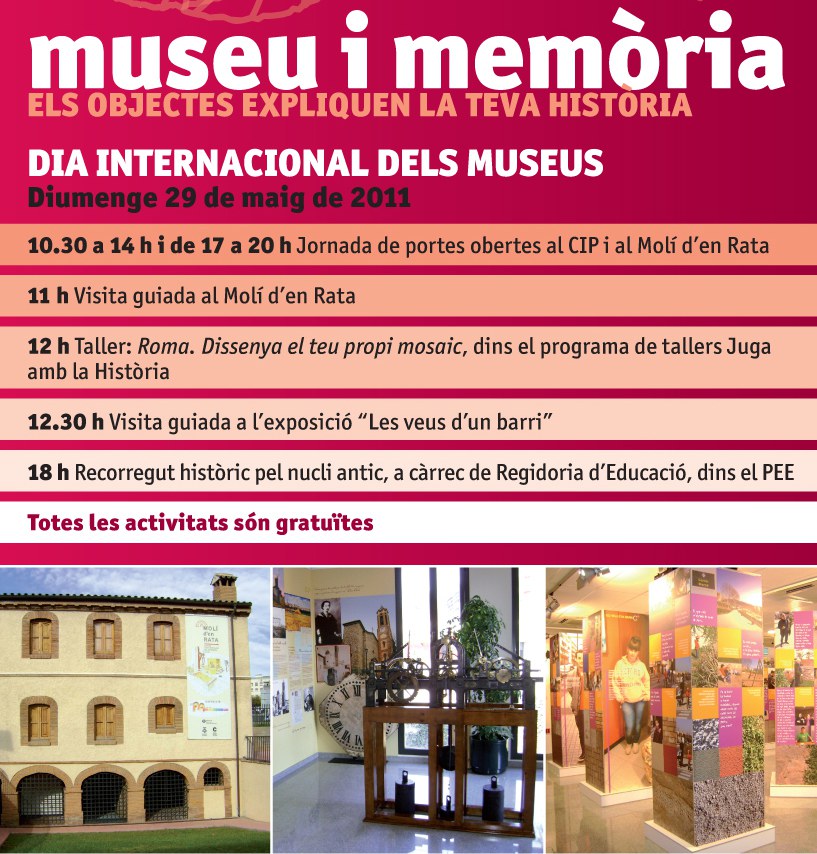 Amb motiu de la celebració de la 33a edició del Dia Internacional dels Museus, l'àrea de Patrimoni del Patronat Municipal de Cultura ha organitzat tota una serie d'activitats sota el títol Museu i Memòria. Els objectes expliquen la teva història, que es realitzaran el proper diumenge, 29 de maig, al Centre d'Interpretació del Patrimoni Molí d'en Rata. Durant tot el dia, hi haurà jornada de portes obertes al Centre d'Interpretació del Patrimoni i al Molí d'en Rata; l'horari serà de 10.30 a 14 h i de 17 a 20 h.