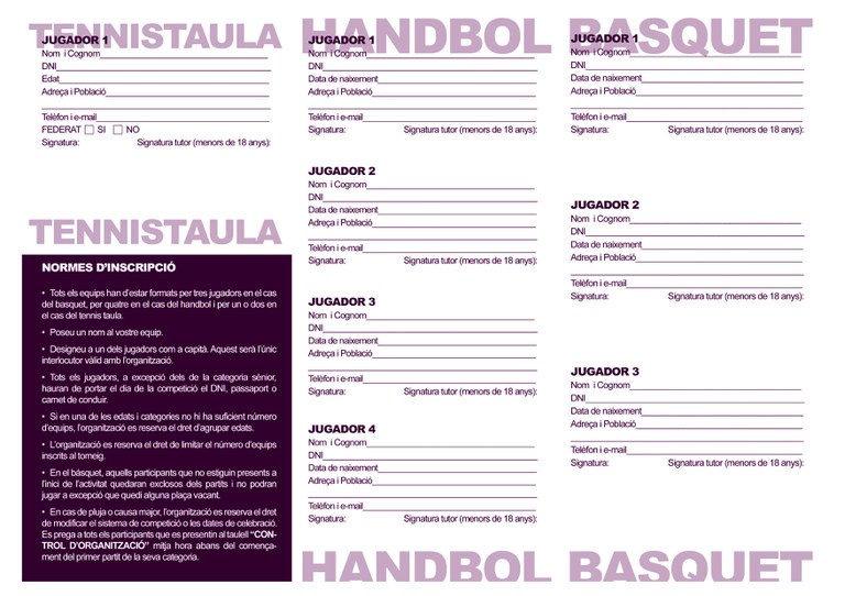 El Patronat Municipal de Cultura ha obert el termini d'inscripcions per participar al Torneig de Bàsquet 3x3, al d'Handbol i a la Gimcana/Torneig de Tenis Taula que tindran lloc amb motiu de la Festa Major 2011. Durant tot el mes de juliol i del 22 al 26 d'agost es podran recollir al Centre Cultural les butlletes d'inscripció, que un cop omplertes s'han de lliurar al mateix centre.