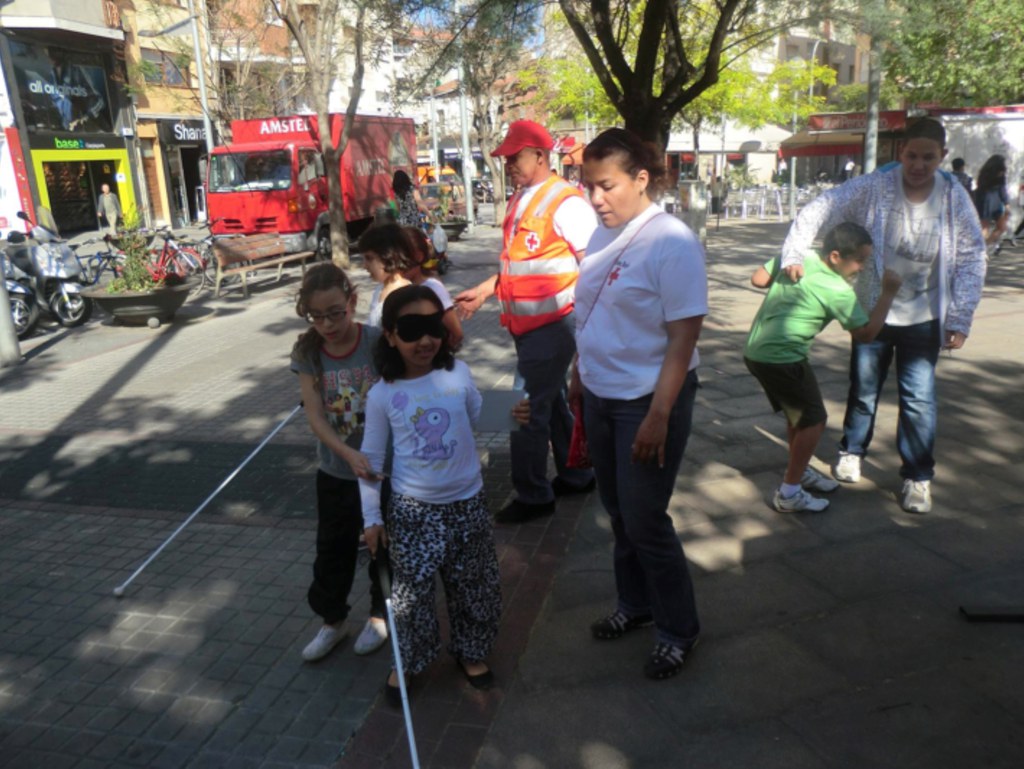 Així, els participants van fer un recorregut amb un antifaç, van tocar textures rugoses, llises, esperats. També van treballar l'oïda escoltant diferents sorolls, l'olfacte, olorant diferents plantes aromàtiques, a més d'anar pel carrer amb cadira de roda o un bastó d'invident també amb els ulls tapats. Paral·lelament es va repartir informació sobre les activitats que fa la entitat i Creu Roja Joventut van fer una activitat lúdica pels infants.