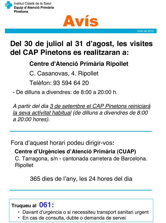 Del 30 de juliol al 31 d'agost, les visites al CAP Pinetons es realitzaran al Centre d'Atenció Primària Ripollet (CAP Ripollet), al carrer de Casanovas, 4. L'horari d'atenció serà de 8 del matí a 8 del vespre. Fora d'aquest horari, caldrà dirigir-se al Centre d'Urgències d'Atenció Primària, el CUAP, al carrer de Tarragona, s/n. A partir del 3 de setembre el CAP Pinetons reinciarà la seva activitat habitual, de 8 a 20 hores. Recordin que per a qualsevol urgència, consulta o dubte, poden trucar al número de sanitat respon 061.