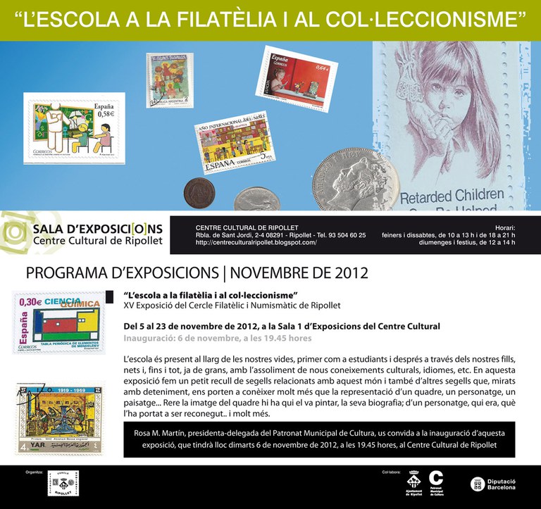 L'entitat local celebra el seu aniversari amb una mostra mixta de filatèlia, numismàtica i col·leccionisme, sota el títol L'escola a la filatèlia i al col·leccionisme. D'una banda, es podrà veure l'exposició 100 anys de llibres de text i material escolar, elaborada per Miquel Gallego, i, d'altra, una mostra sobre els 50 anys de l'Escola Sant Gabriel. Així, a més de segells i monedes antigues, els visitants podran veure com ha evolucionat el món de l'educació, quant als materials i llibres que s'utilitzaven ara fa més d'un segle a les escoles. L'exposició s'inaugurà el 6 de novembre, a les 19.45 h.