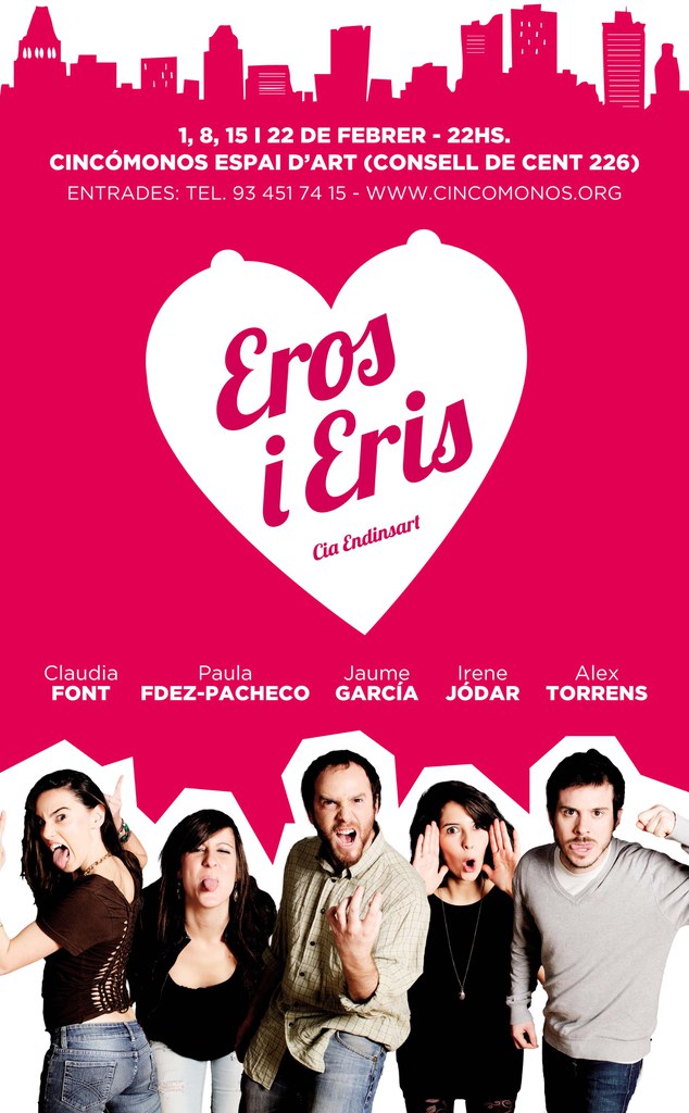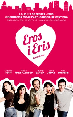 Què passaria si dues parelles i una noia joves comencessin a confondre sentiments fruit de la monotonia de les seves vides? Traïció, sensualitat, passió i, finalment, la mort, són els acompanyants perfectes per a aquesta lluita entre la coherència i el desig. Així defineix Jaume Garcia la seva obra Eros i Eris que s'estrena avui al Cincomonos Espai d'Art.