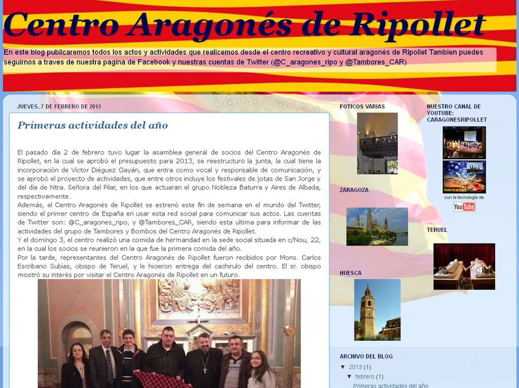 Després de la posada en marxa del twitter de l'entitat, El Centro Aragonés de Ripollet també ha posat en marxa el seu blog i un canal de Youtube.