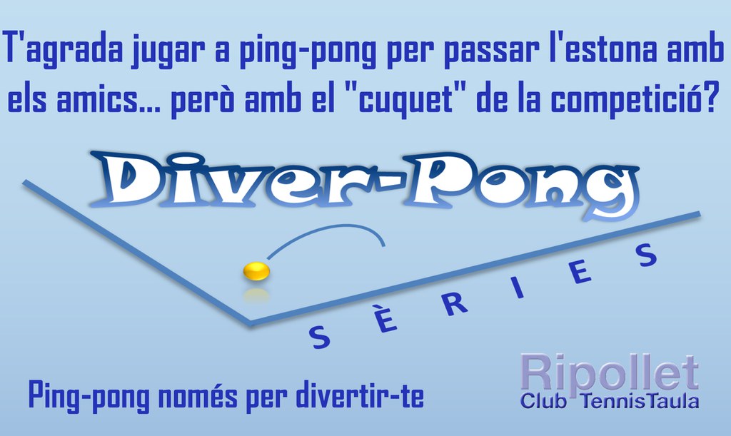 El Club Tennis Taula de Ripollet ha organitzat les Diver-Pong Sèries, que tindran lloc a partir del 4 de maig. Es tracta d'uns tornejos per a aficionats al tennis taula on el més important és passar-s'ho bé. Les inscripcions es poden fer el mateix dia de la competició i el preu es de 5 euros. Hi haurà regals per a tots els participants, trofeu per al guanyador i aperitiu de germanor després de cada sèrie.
