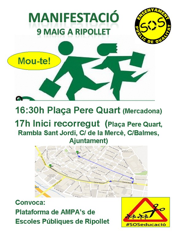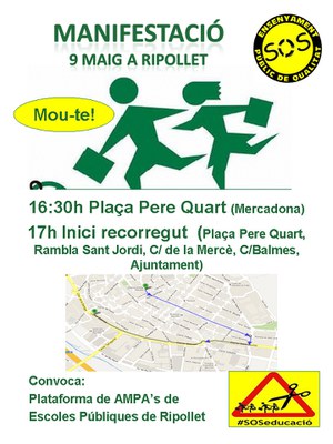 Amb motiu de la Vaga General d'Educació que ha convocat el Marc Unitari de la Comunitat Educativa (MUCE) a totes les etapes educatives, contra les retallades i la Llei Wert, la Plataforma de AMPA de les escoles públiques de Ripollet ha convocat una manifestació a la vila pel proper 9 de maig.