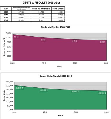 Amb 235,76 euros per habitant, per segon any consecutiu, Ripollet és el 3r municipi de més de 20.000 habitants menys endeutat de Catalunya. Aquestes dades són les ofertes pel Ministeri d'Hisenda a 31 de desembre de 2012. Per davant de Ripollet només estan Cornellà de Llobregat i Sant Adrià del Besòs, que també repeteixen posició a la taula.