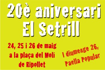 El cap de setmana del 24 al 26 de maig es presenta farcit d'activitats i propostes per a grans i petits. El divendres al vespre es donarà el tret de sortida la festa pel 20è aniversari d'El Setrill, amb degustació de plats realitzats pels socis de l'entitat gastronòmica, que s'allargarà tot el cap de setmana. Dissabte, cap a les 19 hores, se sumaran a la celebració les actuacions de grups musicals locals, monòlegs i un conjunt de blues i diumenge el matí la festa culinària estarà amenitzada per una mostra d'Els Miserables, una cantada d'havaneres amb l'Espingari i quatre paelles per a un total de 800 persones. Ripollet Ràdio posarà banda sonora a la festa, punxant en diferents moments.La festa està organitzada per l'Associació Gastronòmica El Setrill, amb la col·laboració de Moritz i el Patronat de Cultura.
