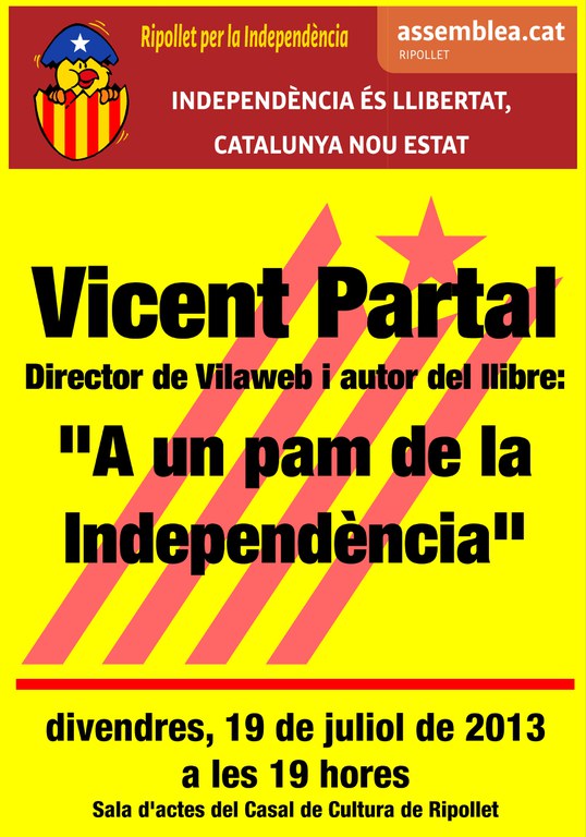La secció local de l'Assemblea Nacional Catalana ha organitzat per aquest divendres una xerrada al Centre Cultural amb Vicent Partal, director de Vilaweb i autor del llibre A un pam de la independència. L'acte serà a les set de la tarda. D'altra banda, el diumenge, 21 de juliol, l'entitat farà una recollida de signatures per demanar la independència davant el Centre Cultural, durant el matí.