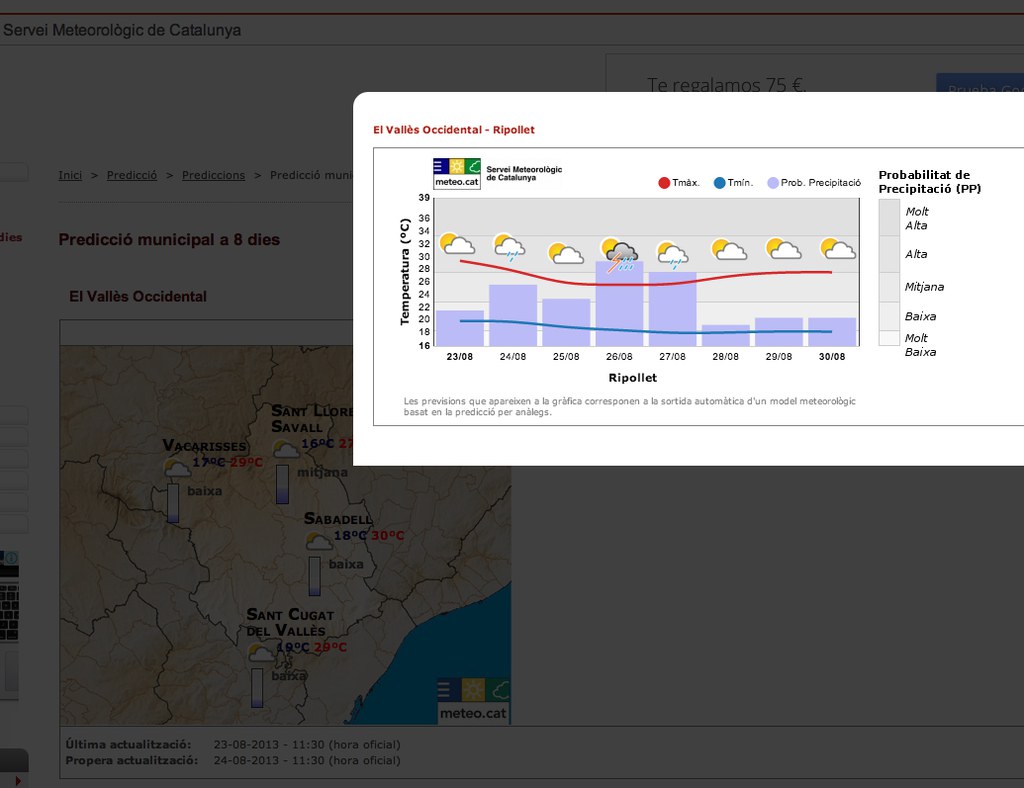 Segons les previsions del Servei Meteorològic de Catalunya, s'espera pluja per dissabte a la tarda i diumenge al matí. Davant d'aquesta situació, el Patronat Municipal de Cultura ha previst una sèrie de canvis d'ubicació de la majoria d'activitats per tal que es puguin celebrar igualment. En cas de pluja dissabte, el pregó, el Ball de gitanes, els Versots i el concert de The Ladies es traslladarien al pati del col·legi Anselm Clavé. El castell de focs, si ha està muntat, es podria tirar malgrat que plogui, i el Correfoc, si plou poc, també se celebraria. El ball de mitjanit d'Amics del Ball es traslladaria a l'interior del pavelló Joan Creus. Pel que fa a diumenge, l'Exhibició d'Arrossegament quedaria suspesa. La Mostra de bestiari segurament es traslladaria al Pavelló annex, sense tirar foc. El Vermut Jazz es faria al col·legi Clavé, però la paella popular quedaria anul·lada. Hi ha actes com els escacs, la Mostra de plaques de cava i les inscripcions de la Marató de Fotografia que es farien entre el vestíbul del Centre Cultural i la Sala d'Actes. Ja a la tarda, les sardanes es passarien al Pavelló annex. El concert i el ball de l'Orquestra Costa Brava se celebrarien tot a l'interior del Pavelló. Finalment, el concert de Wax & Boggie es farà al pati del Clavé.