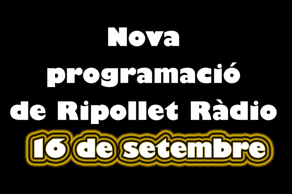 La ràdio municipal reprèn aquest 16 de setembre la nova programació. La temporada 2013-2014 incorpora nous espais com ara el magazín A la corda fluixa, Des de la història, Segundos fuera -de boxa- i Runnig RUA, realizat per l'entitat Ripollet Unió Atlètica, que se suma a les 9 entitats que ja tenen espai a la ràdio de Ripollet. A més, tornen a l'antena local A tot jazz, la tertúlia esportiva Fora de lloc i Infosport. Aquest darrer compta amb un nou equip de col·laboradors, que cada dilluns a les 19 hores oferirà un resum de l'actualitat dels clubs i esportistes locals. Ripollet Ràdio compta amb 40 programes, realitzats per un total de 70 voluntaris i 10 entitats.
