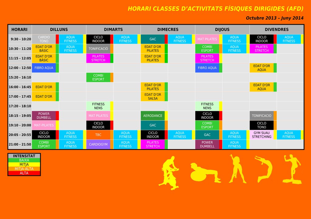 Aquest octubre s'han reprès les classes de les activitats dirigides del Poliesportiu, que compten amb 16 especialitats per a tots els públics i intensitats. Hi ha prop de 60 sessions setmanals, entre les 9.30 i les 21.50 hores. Com a novetat, enguany es pot fer la inscripció per internet. També han començat ja els cursets de natació, mentre que la inscripció del trimestre gener-març de 2014 serà del 9 al 13 de desembre.