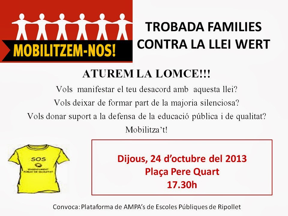 Dijous 24 d'octubre, la Federació de Treballadors de l'Ensenyament, així com la UGT i CCOO, han convocat una vaga general de 24 hores als centres educatius per mostrar la seva posició contrària a l'establiment de la LOMCE i contra les retallades que ha patit el sector. Des de la Plataforma d'AMPA de les escoles públiques de Ripollet també s'ha donat suport a aquesta convocatòria i s'ha organitzat una concentració, a les 17.30 hores, a la plaça de Pere Quart.