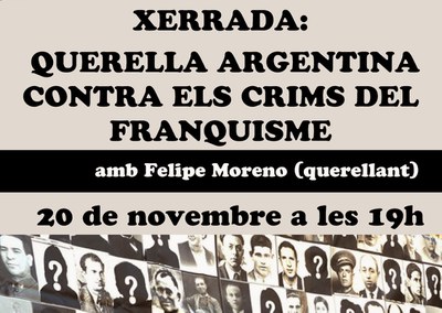 La xerrada tindrà lloc a El Local, carrer Monturiol número 32. Comptarà amb la presència de Felipe Moreno membre de la Xarxa de Catalano-Balear de suport a la Querella Argentina. El propi Felipe Moreno és un dels querellants, ja que va ser detingut, torturat, i empresonat per la Brigada Político-Social de la dictadura franquista.