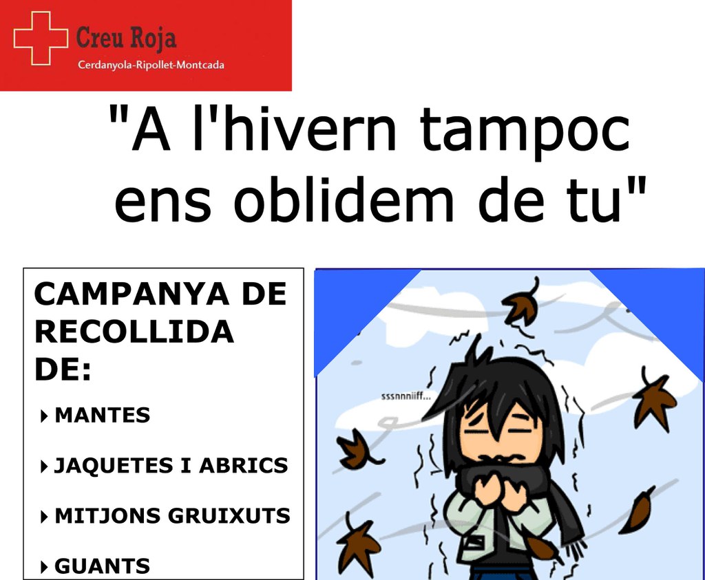 L'Assemblea local Creu Roja Cerdanyola-Ripollet-Montcada ha endegat un any més la campanya A l'hivern tampoc ens oblidem de tu amb l'objectiu de recollir mantes, jaquetes i abrics, mitjons gruixuts i guants per després distribuir aquesta roba entre les persones que no disposen de recursos i la necessiten.