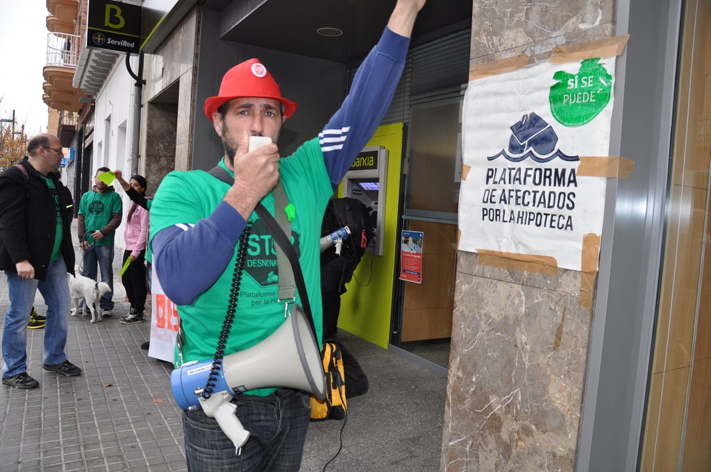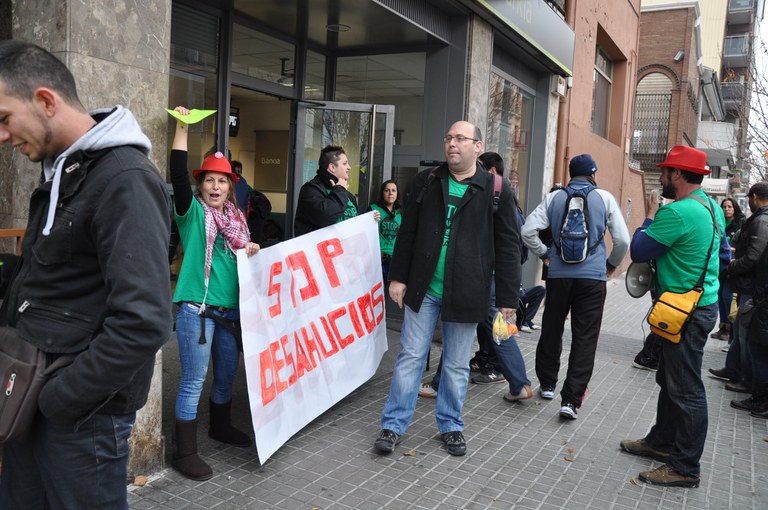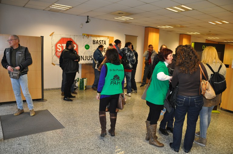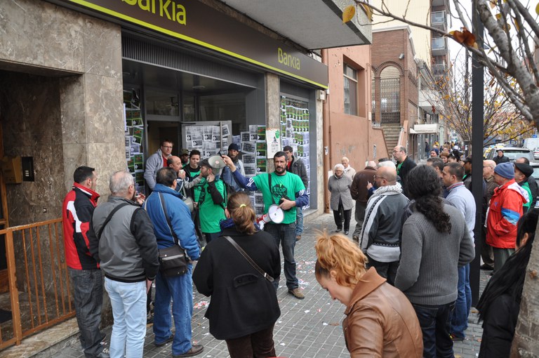 Una vintena de membres de la Plataforma d'Afectats per la Hipoteca Cerdanyola-Ripollet han ocupat pacíficament aquest dimecres, 11 de desembre, l'oficina de Bankia de la Rambla de Sant Jordi, reclamant un acord de dació en pagament del préstec hipotecari d'un veí i la seva mare, de 80 anys. Segons la Plataforma, el banc vol desnonar tant el fill com a l'àvia, que figurava com a cotitular i embargar les dues vivendes. Després d'una llarga negociació sense resultats, la Plataforma reclama ara poder parlar amb un càrrec superior i continuarà amb les seves protestes fins aconseguir-ho. Després d'estar tot el matí a les portes del banc, la Plataforma va anunciar que havien trencat negociacions, donat que Bankia els havia proposat retirar una part del deute però no acceptaven la seva principal reivindicació, que era rescindir la cotitularitat de la mare en la hipoteca. Finalment, la Plataforma ha aconseguit una reunió amb un responsable territorial de Bankia, que tindrà lloc el proper dilluns, 16 de desembre.