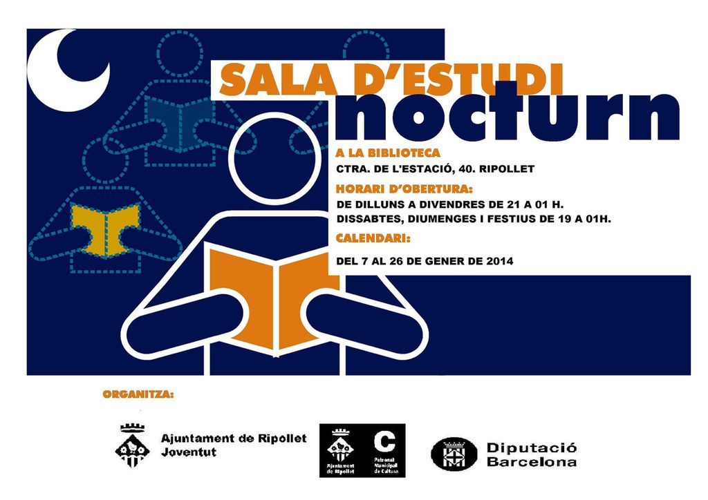 Des del dia 7 de gener i fins al dia 26, amb motiu del període d'exàmens, la Biblioteca acull un any més la Sala d'Estudi Nocturn. L'horari d'atenció als estudiants serà de dilluns a divendres de 21 a 1 de la matinada i dissabtes de 19 a 1 de la matinada.