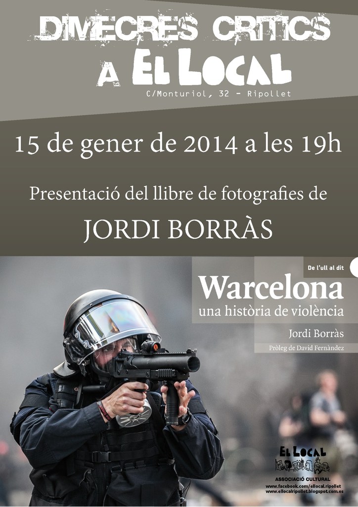 Inclòs en el cicle de xerrades dels dimecres Cítics, El Local del carrer Monturiol, 32 celebra aquest dimecres, 15 de gener, la presentació del llibre de fotografies de Jordi Borràs, Warcelona, una història de violència. Serà a les set de la tarda.<mes>
