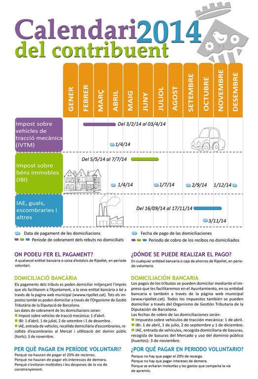 Amb l'inici del nou any, comença un nou exercici fiscal i es publica el nou calendari de pagaments de les taxes i impostos municipals. Recordar que, des de l'1 de gener, l'Organisme de Gestió Tributària de la Diputació de Barcelona (ORGT), a banda de gestionar l'impost de circulació (IVTM) i les multes, també s'encarrega de la gestió, liquidació i recaptació de l'IBI, l'IAE, la plusvàlua i la taxa d'escombraries. S'encarrega igualment de la recaptació en executiva de tots els tributs municipals i altres ingressos de dret públic local.