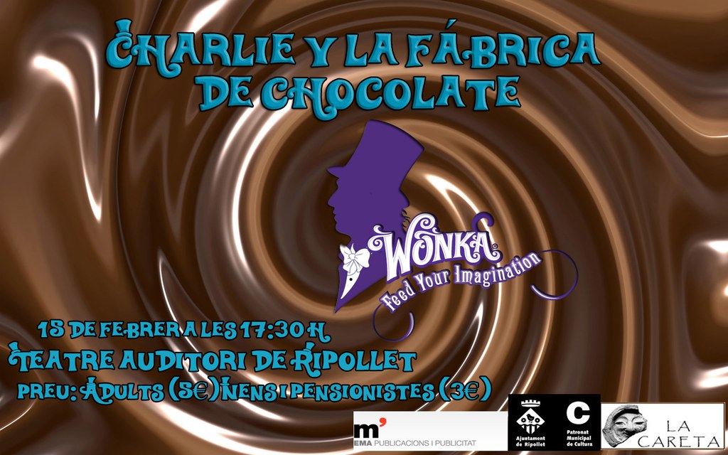 Aquest dissabte, 15 de febrer, la companyia de teatre local La Careta estrena aquesta fantàstica obra que explica la història de Charlie Bucket, un nen d'una família pobre, que viu un canvi en la seva vida quan guanya el concurs que li permetrà, juntament amb quatre nens més d'altres parts del món, visitar la fàbrica de xocolata comandada per l'excèntric Willy Wonka i els seus Oompa-Loopas. La representació serà a 2/4 de sis de la tarda al Teatre Auditori del Mercat Vell i el preu de les entrades és de 5 euros per als adults i 3 euros per als nens i pensionistes.