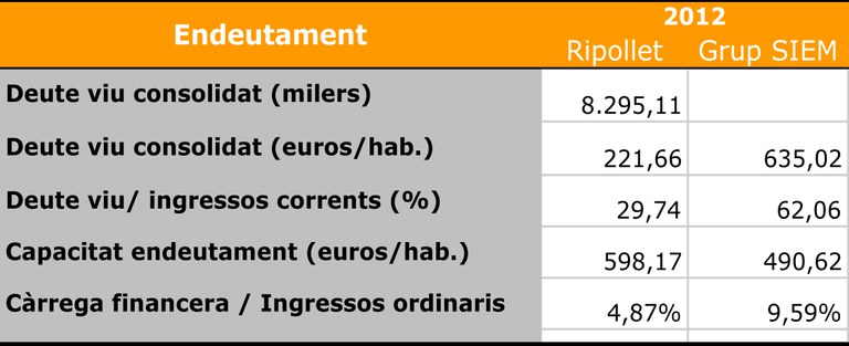Del darrer estudi, realitzat amb dades del pressupost 2012, s'extreu que el deute de l'Ajuntament de Ripollet era de 221,66 euros/habitant. Aquesta xifra estava molt per sota de la mitjana dels ajuntaments del seu grup SIEM, que era de 635,02 euros/habitant. Actualment està en 186,5 euros/habitant, un 16 % menys que a 2012.