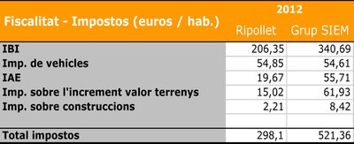 Ripollet també té una fiscalitat més baixa que la resta d'ajuntaments de 20.000 a 100.000 habitants, 298,10 euros/habitant, front els 521,36 de la mitjana. On hi ha més diferència és en l'IBI.