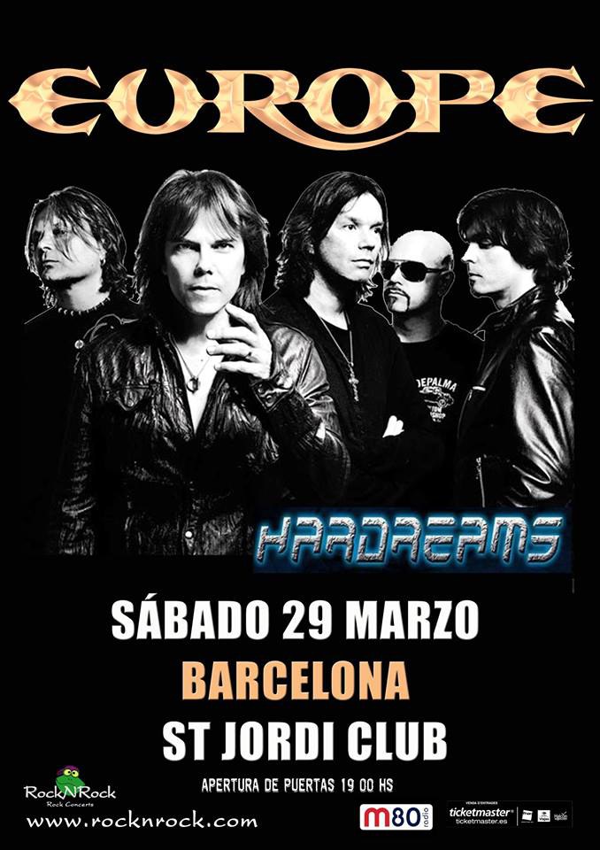 La nit del dissabte, 29 de març, el Sant Jordi Club de Barcelona acollirà un concert de Hardreams, el grup de hard rock melòdic dels ripolletencs Manu Esteve, David Agüera, Sergi Hormigó, Victor Muiño i Sergi Segarra, que faran de teloners de la banda Europe al seu pas per Barcelona. L'obertura de portes de la sala de concerts serà a les 19h.