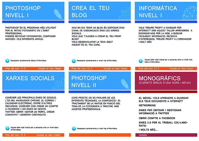 Tallers d'un mes de durada adreçats especialment a entitats locals i associacions de veïns. Aquests tallers són gratuïts pels membres de les entitats locals i associacions de veïns. Dimarts i dijous, de 19 a 21 h.