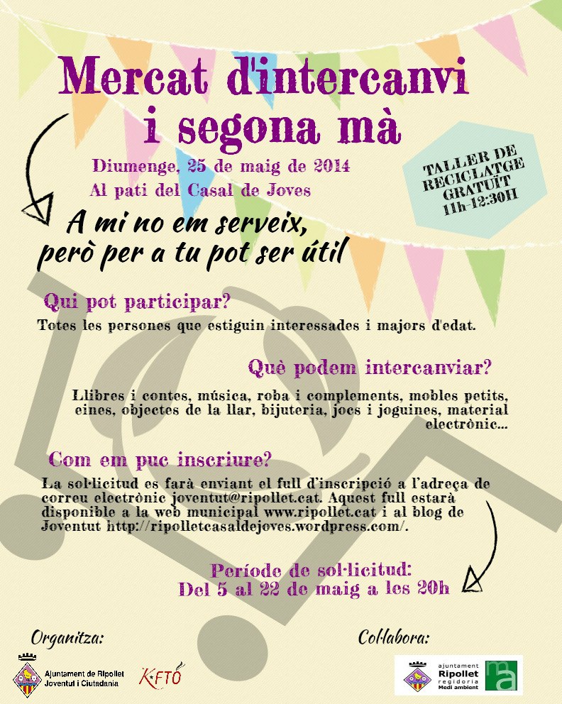 Fins el proper dia 22 de maig es poden fer les inscripcions per a participar en el primer mercat d'intercanvi i de segona mà, organitzat per la Regidoria de Joventut i Ciutadania, des del projecte KFTÓ del Casal de Joves. Aquest mercat tindrà lloc el proper diumenge, 25 de maig, de 10 a 14 hores, al pati del Casal de Joves.
