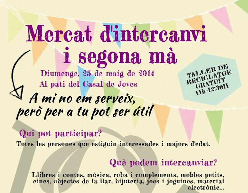 El proper 25 de maig es realitzarà un Mercat d'Intercanvi i segona mà al pati del Casal de Joves. Aquesta activitat està organitzada des de la Regidoria de Joventut i Ciutadania de l'Ajuntament de Ripollet amb els joves del Casal interessats en fer aquesta proposta i compta amb la col·laboració de la Regidoria de Medi Ambient. En aquest mercat es podran intercanviar llibres, contes, música, roba complements, mobles petits, eines, objectes de la llar, bijuteria, joguines, material electrònic. Tot allò que estigui en bon estat i que penseu que podeu canviar per algun estri que necessiteu.